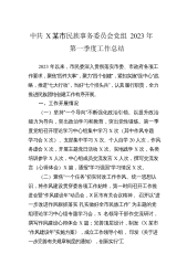 中共X某市民族事务委员会党组2023年第一季度工作总结2023年以来,市民委深入贯彻落实市委、市政府各项工作要求,聚焦“四件大事”,聚力“四个创建”,紧扣实施“强中心”战略,推进“七大行动”,当好“七个排头兵”,认真履行职责,全力推进民族团结创建工作有序开展。一、工作开展情况(一)坚持“一个导向”不断强化政治引领。以提升政治能力为导向,突出政治学习和教育,突出党性锻炼。第一季度党组召开理论学习中心组集中学习X次(其中作风专题学习会X次)、支部集中学习X次、个人自学20人次,作风务虚会X次,开展主题党日活动X次、实地践学X次,各类培训参学X人次,中心组成员交流发言X人次,撰写交流发言(心得体会)...