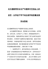在主题教育安全生产专题研讨交流会上的发言:以学促干学干结合筑牢高质量发展安全防线在主题教育安全生产专题研讨交流会上的发言 自主题教育开展以来,我局着力在“以学铸魂、以学增智、以学正风、以学促干”上下真功,持续推进理论学习、落实主体责任、隐患排查等全力推动“三管三必须”安全监管责任落实,力求把学习成果转化为解决问题、改进工作的实际举措,引领应急管理工作迈上新台阶,筑牢安全防线以推动高质量发展。我汇报的题目是“以学促干学干结合筑牢高质量发展安全防线”,主要汇报三个方面: 一、加强理论学习,提升监管执法人员综合素质。一是进一步加强我县安全生产教育培训工作,召开安全生产会暨“大宣传大学习大培训”动...