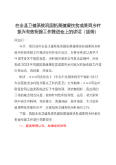 在全县卫健系统巩固拓展健康扶贫成果同乡村振兴有效衔接工作推进会上的讲话(提纲)同志们:今天,我们召开全县卫健系统巩固拓展健康扶贫成果同乡村振兴有效衔接工作推进会召开这次会议,主要任务是认真学习中省市县关于脱贫攻坚、乡村振兴相关文件及会议精神,对全系统2023年巩固拓展健康扶贫成果同乡村振兴有效衔接工作进行再动员、再部署、再落实。刚才,×××同志传达了《中共中央国务院关于做好2023年全面推进乡村振兴重点工作的意见》文件精神;×××同志对防返贫同台监测系统进行了专题培训。讲的都很好,直击我们工作的难点堵点问题,很有针对性和指导性,会后,请大家对照中省文件精神、培训要点,查漏补缺,固本强基,大力提...