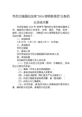 市烈士陵园纪念馆“2024清明祭英烈”公祭烈士活动方案为切实做好2024年“清明节”期间烈士祭扫组织服务工作,确保烈士祭扫工作安全、文明、规范、平稳、有序,按照《烈士公祭办法》,特制定“2024清明祭英烈”公祭烈士活动方案。具体如下:一、活动时间3月28日—4月3日(每日上午9:30开始)二、活动地点市烈士陵园三、参加人员仪式开始后位于烈士陵园园区内的全体人员。四、活动议程活动由烈士陵园工作人员主持。(一)主持人向烈士纪念碑(塔等)行鞠躬礼,宣布烈士公祭仪式开始;(二)奏唱《中华人民共和国国歌》;(三)参加活动的党员重温入党誓词;(四)少先队员献唱《我们是共产主义接班人》;(五)向烈士敬献花篮...