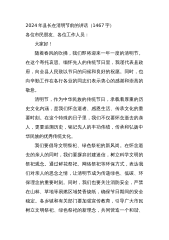 在清明节祭扫工作部署会上的讲话同志们:清明节是人员集聚、隐患叠加的敏感时期,做好清明祭扫服务保障工作意义重大。刚才,**同志部署了清明节祭扫相关工作,**、**汇报了属地清明祭扫安排部署情况,***等*家单位结合职责做了交流,我都同意,希望认真抓好贯彻落实。下面我讲三点意见。一、突出重点重抓,迅速进入清明祭扫应战状态今年是新冠病毒感染实行“乙类乙管”后,全面放开现场祭扫的第一个清明节,广大群众祭扫悼念、追思亲人的需求将在较短时间内集中释放,外地返乡祭扫人数预计将会剧增,给清明期间服务保障、安全管理工作带来较大压力对此,各地各相关部门要从现在开始准备、迅速行动,分工负责、协作配合,确保清明祭扫平...