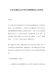 在XX区服务企业专项行动部署推动会上的讲话同志们:今天,我们召开全区服务企业专项行动部署推动会,主要任务是深入学习贯彻党的二十届四中全会精神和习近平总书记视察XX重要讲话精神,认真落实市委十二届七次全会决策部署,动员全区上下立即行动起来,以更高标准、更大力度、更实举措,全面启动服务企业专项行动,为确保“十四五”圆满收官、“十五五”良好开局,注入强劲动力。刚才,XX同志已经对《XX区服务企业专项行动方案》进行了全面部署,方案目标明确、措施具体、责任清晰,我完全同意,请大家务必深刻领会,结合各自职责,不折不扣地抓好贯彻落实。下面,我再强调三点意见。一、登高望远,深刻把握服务企业专项行动的时代内涵与...