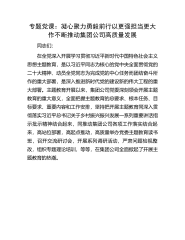 专题党课:凝心聚力勇毅前行以更强担当更大作不断推动集团公司高质量发展同志们:在全党深入开展学习贯彻习近平新时代中国特色社会主义思想主题教育,是以习近平同志为核心的党中央全面贯彻党的二十大精神、动员全党同志为完成党的中心任务而团结奋斗所作的重大部署,是深入推进新时代党的建设新的伟大工程的重大部署。主题教育开展以来,集团公司党委深刻领会开展主题教育的重大意义,全面把握主题教育的总要求、根本任务、目标要求、重要内容和工作安排,坚持把开展主题教育同深入贯彻落实习近平总书记关于乡村振兴振兴发展一系列重要讲话指示批示精神结合起来,同推动集团公司各项工作落实结合起来,高站位部署,高起点推动,高质量举办党委主...
