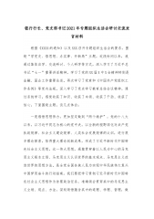 银行行长、党支部书记2021年专题组织生活会研讨交流发言材料根据《XXXX的通知》以及XXX召开专题组织生活会的要求,围绕“学党史、悟思想、办实事、开新局”主题,近段时间以来,我通过集体自学、交流研讨、个人研学等方式,深入学习了习近平总书记“七一”重要讲话精神,学习了党的XX届X中X会精神特别是金融、国企工作重要论述,再次学习了党章和《中国共产党组织工作条例》等党内法规,深入学习了党史学习教育总结会议精神。通过系统学习,感觉收获了知识、收获了本领、收获了干劲、收获了信心,下面围绕主题,谈几点体会:一是感悟思想伟力,更加坚定做到“两个维护”。党的十八大以来,以习近平同志为核心的党中央,以全新的视...