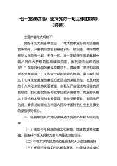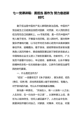七一党课讲稿:争做新时代的合格党员(纲要)“我志愿加入中国共产党,拥护党的纲领,遵守党的章程,履行党员义务,执行党的决定,严守党的纪律,保守党的秘密,对党忠诚,积极工作,为共产主义奋斗终身,随时准备为党和人民牺牲一切,永不叛党。”——中国共产党入党誓词201x年是伟大的中国共产党成立x周年。从嘉兴南湖的红船到抗日战争的峥嵘岁月,从新中国成立到改革的春风吹拂的x周年,中国人民在中国共产党的领导下,走过了一条艰苦卓绝的奋斗历程。成立x年,中国共产党从一个不到60人的“地下党”,逐步发展壮大到拥有8900多万党员的世界最大执政党。党的地位变了、实力强了,但是对于每一名共产党员来说,做合格党员,却是永...
