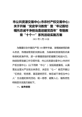 市公共资源交易中心(市农村产权交易中心)关于开展“党史学习教育”暨“牢记殷切嘱托忠诚干净担当喜迎建党百年”专题教育“十个一”系列活动实施方案2021年3月10日为隆重纪念中国共产党100周年华诞,深情回顾党的奋斗历史,热情讴歌党的光辉业绩,为继承和发扬党的光荣传统和优良作风,进一步增强党组织的凝聚力和战斗力,持续发挥党建工作引领作用,市公共资源交易中心(市农村产权交易中心)(以下简称“中心”)党组高度重视,认真落实全面从严治党主体责任,决定在“七一”前后开展以“忆党史、铭党恩,喜迎建党百年,做忠诚干净担当中心人”为主题的系列活动,统一思想、凝聚人心、锻炼党性特制定本实施方案如下。一、指导...