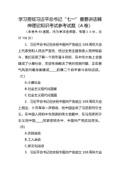 学习贯彻习近平总书记“七一”重要讲话精神理论知识考试参考试题(A卷)(本卷共40道题,均为单项选择题。每题2.5分,总计100分)1.习近平总书记在庆祝中国共产党成立100周年大会上代表党和人民庄严宣告,经过全党全国各族人民持续奋斗,我们实现了第一个百年奋斗目标,在中华大地上全面建成了小康社会,历史性地解决了绝对贫困问题,正在意气风发向着全面建成的第二个百年奋斗目标迈进。(C)A.小康社会B.社会主义现代化国家C.社会主义现代化强国2.习近平总书记在庆祝中国共产党成立100周年大会上指出,十月革命一声炮响,给中国送来了马克思列宁主义。在中国人民和中华民族的伟大觉醒中,在马克思列宁主义同中国的紧...