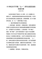 单位庆祝中国共产党成立102周年系列活动方案为隆重纪念中国共产党成立102周年,回顾党的光辉历程,讴歌党的丰功伟绩,进一步激发基层党组织活力,增强全体党员的光荣感、责任感和使命感,引导广大党员继承和发扬党的光荣传统,带动全体员工积极投身到推进中国式现代化的实践中去,掀起学习贯彻习近平新时代中国特色社会主义思想主题教育热潮,现制定方案如下:一、掀起学习研讨热潮为深入推进主题教育关于“学思想”的部署安排,根据总体规划和当前的学习进度,重点开展两项活动:1.专题党课大家讲活动以推进中国式现代化XX实践(XX为本单位简称)为主题,以各单位党委班子成员和党支部书记为主体,党组织书记“七一”期间面向本级组...