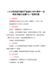 ××公司庆祝中国共产党成立101周年“一先两优”表彰大会暨“七一”党课方案一、时间地点时间拟定为2022年6月29日(星期三)上午9:00。地点拟定为××公司工人文化宫。二、参会范围主持人:党委副书记、纪委书记×××主会场:公司在家班子成员,本部正科级以上干部,各单位班子成员、部分先进代表,离退休老干部、老党员代表。(预计为xxx人左右,文化宫最多容纳xxx人)分会场:各单位全体党员。三、会标名称主会标:××公司庆祝中国共产党成立101周年“一先两优”表彰大会暨“七一”党课大厅入口横幅:热烈庆祝中国共产党成立101周年四、会议议程(一)会议议程1.党委副书记、纪委书记×××宣布大会开始;2.全...
