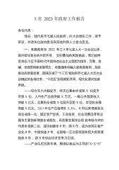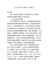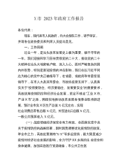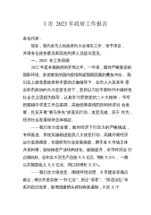 X市2023年政府工作报告各位代表:现在,我代表市人民政府,向大会报告工作,请予审议,并请各位政协委员和其他列席人员提出意见。一、2022年工作回顾2022年是韶关应对风险挑战、经受重大考验、坚定平稳发展的一年。面对复杂严峻的国内外形势,以及多起本土疫情、历史罕见洪涝灾害、持续高温干旱等多重超预期因素叠加冲击,我们坚持以习近平新时代中国特色社会主义思想为指导,深入贯彻落实党的十九大和十九届历次全会精神,认真学习贯彻党的二十大精神和省委十三届二次全会工作部署,在市委的正确领导下,在市人大及其常委会、市政协的监督支持下,高效统筹疫情防控和经济社会发展,统筹发展和安全,着力稳增长、防疫情、保稳定、惠...