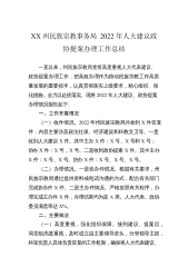 XX州民族宗教事务局2022年人大建议政协提案办理工作总结一直以来,州民族宗教局党组高度重视人大代表建议、政协提案办理工作,把高效办理作为推动民族宗教工作高质量发展的重要抓手,认真贯彻落实上级要求,精心组织、强化措施,全力以赴抓落实。现将2022年人大建议、政协提案办理情况报告如下:一、工作开展情况(一)收件情况。2022年州民族宗教局共收到X件答复件,内容主要涉及政法社保、经济建设和科教文卫等。一是收到人大建议X件。其中主办X件:X号、X号和X号;协办X件:X号,X号。二是收到政协提案X件。其中主办X件:X号、X号。协办X件:X号、X号、X号。(二)办理情况。一是协办件情况。根据有关要求,州...