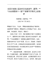 在四川省第八届乡村文化旅游节(夏季)***分会场暨第十一届***避暑节开幕式上的致辞市委常委、区委书记****(2017年7月30日)尊敬的**主任、**会长,尊敬的省旅游协会**秘书长、省体育局**调研员,尊敬的市人大常委会**主任,各位领导、各位嘉宾,同志们、朋友们:大家上午好!今天,我们相聚在中国十大避暑名山--**,隆重举行四川省第八届乡村文化旅游节(夏季)**分会场暨第十一届曾家山避暑节开幕式。在此,我谨代表中共广元市**区委、区人大、区政府、区政协和21万***人民,向莅临本次活动的各位领导、各位嘉宾表示热烈的欢迎!向长期以来关心支持***发展的各界朋友表示衷心的感谢!***,地处...