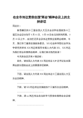 在全市传达学习全国“两会”精神领导干部大会上的总结讲话及主持词同志们:今天,我们召开全市传达学习全国“两会”精神领导干部大会上,主要任务是认真贯彻习2023年全国“两会”精神、习近平总书记在全国两会期间重要讲话精神和十四届全国人大一次会议、全国政协十四届一次会议精神,安排部署X市市贯彻落实工作,切实动员全市上下进一步统一思想,坚定信心,聚焦重点,实干攻坚,全力推动经济社会高质量发展。出席今天会议的有:市委常委,市人大常委会、市政府、市政协领导班子成员和党组成员,市法院院长、市检察院检察长,市军区有关负责同志,X级以上领导干部。参加今天会议的有:市直各机关、各县区、X经济技术开发区职能部门有关负...