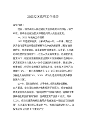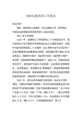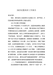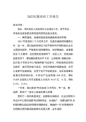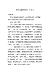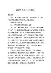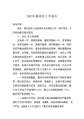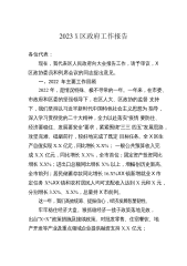 2023X区政府工作报告各位代表:现在,我代表区人民政府向大会报告工作,请予审议,X区政协委员和其他列席人员提出意见。2022年主要工作和成效2022年是党的二十大召开之年,也是余杭发展史上极具考验和极不平凡的一年。一年来,我们坚持以习近平新时代中国特色社会主义思想为指导,认真落实上级党委、政府和区委的决策部署,在区人大和区政协的监督支持下,全区上下踔厉奋发、笃行实干,紧紧围绕“建设X市新中心、争当‘两个先行’排头兵”的战略目标,统筹落实“疫情要防住、经济要稳住、发展要安全”三件大事,付出了最大努力,争取了最好结果,以优异成绩向党的二十大献礼。全年实X区生产总值X.X亿元;完成财政总收入X.X...