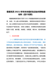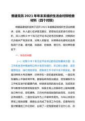 领导干部2021年度组织生活会“四个对照”个人对照检查材料(县级常务副部长)根据《中共××县委组织部关于召开2021年度基层党组织组织生活会和开展民主评议党员的通知》要求,本人结合一年来的学习、工作、生活等实际情况,对照“D中Y和习近平总书记的号召和要求、新时代合格党员标准、入党誓词、革命先辈和先进典型”等4个方面,全面查找在政治、思想、学习、工作、能力、纪律、作风等方面的问题和不足,并进行了认真反思,提出了整改措施,明确了下一步努力方向。现将个人对照检查情况汇报如下。一、存在的问题(一)对照D中Y和习近平总书记的号召和要求方面。虽然本人在平时工作和生活中,能够始终坚定正确的政治方向,积极响应...