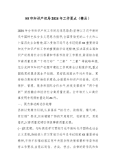 XX市知识产权局2026年工作要点(精品)2026年全市知识产权工作的总体思路是:坚持以习近平新时代中国特色社会主义思想为指导,全面贯彻党的二十大和二十届历次全会精神,深入贯彻习近平总书记视察XX重要讲话和关于知识产权工作的重要指示论述精神,坚决落实全国知识产权局局长会议部署和市委市政府工作要求,紧密结合我市高质量发展“十项行动”“三新”“三量”等战略举措,充分发挥市知识产权强市建设工作联席会议制度作用,重点围绕更好服务高水平创新、更好促进高水平对外开放、更好助力高标准市场体系建设,全面提升知识产权创造、运用、保护、管理、服务和国际合作水平,有效支撑我市“两个创新”深度融合和经济社会高质量发展...