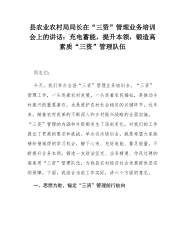 县农业农村局局长在“三资”管理业务培训会上的讲话:充电蓄能,提升本领,锻造高素质“三资”管理队伍同志们:今天,我们举办全县“三资”管理业务培训会。“三资”管理工作,一头连着农村发展,一头连着农民福祉,是推动乡村振兴的重要基石,也是维护农村社会稳定的关键环节。近年来,随着农村改革的不断深入和乡村振兴战略的全面实施,“三资”管理的内涵和外延都发生了深刻变化,对我们的工作提出了更高的要求和挑战。举办这次培训会,就是希望大家能够珍惜难得的学习机会,静下心来、充好电能、蓄足能量,不断提升业务本领,锻造一支政治坚定、业务精通、作风过硬的高素质“三资”管理队伍,为我县农村经济社会发展提供坚实的保障。下面,我...