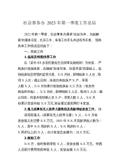 社会事务办2023年第一季度工作总结2022年第一季度,社会事务办秉承“以民为本,为民解困”的服务宗旨,扎实工作,各项工作齐头并进有序开展。现将具体工作情况总结如下:一、民政工作1.低保及特困供养工作以《某市XX乡居民最低生活保障实施细则》为依据,严格执行低保政策,在确保“应保尽保、应退尽退”的基础上,加强低保动态管理的监管力度。X-X月份,新增低保X人次,取消X人次;截止目前,街道共有低保户X户,享受人数X人,X-X月份累计发放低保金X.X万元(包含价格临时补贴)。X-X月份,新增特困X人次,取消X人次;截止目前,街道共有特困人员X户,享受人数X人,X-X月份累计发放补贴X.X万元,资金通过...