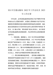 XX州交通运输局2022年工作总结及2023年工作打算今年以来,全州交通运输系统坚持以习近平新时代中国特色社会主义思想为指导,全面深入贯彻落实习近平总书记视察贵州时重要讲话指示精神和州委州政府决策部署,加快建设交通强国先行示范州和深化农村公路管理养护体制改革试点,以“逢山开路、遇水架桥”的信心和决心,奋力推进全州交通运输事业高质量发展,为全州经济社会高质量发展当好先行。一、攻坚克难、接续奋斗,2022年工作扎实有序推进(一)主要经济指标按序推进。2022年全州交通运输固定资产投资目标为X亿元,截止X月底,完成投资X.X亿元,同比增长X.X%(去年同期完成投资X.X亿元),占年度目标任务X.X%...