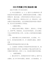 2023年党建工作汇报总结8篇2023年党建工作汇报总结篇1xx年社区党建将以xx大xx届四中全会精神和深入贯彻落实科学发展观为指针,按照街党委的总体部署,以建设管理有序、服务完善、文明祥和的现代文明社区为出发点、落脚点,以解决民生、服务民生为切入点,团结务实,全面加强社区党组织的建设,切实发挥基层党组织的战斗堡垒作用,结合社区实际特制定工作规划:一、加强组织建设。1、加强各支部班子建设。思想统一,团结向上,作风端正,纪律严明,制度落实,信念坚定的党组织。在社区建设中充分发挥好领导核心作用,成为热心为居民服务的坚强战斗堡垒。2、加强对辖区内非公有制经济组织、社会团体、中介组织、民间组织的党建工...