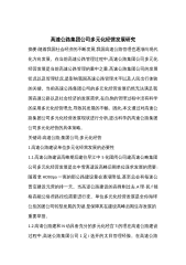 高速公路集团公司多元化经营发展研究摘要:随着我国社会经济的不断发展,我国高速公路管理也逐渐向现代化方向发展。在当前高速公路管理过程中,高速公路集团公司多元化经营发展是当前高速公路管理的重中之重.高速公路集团公司的发展状况以及管理状况,是影响我国高速公路管理水平以及人民出行体验的关键。当前高速公路集团公司的多元化经营发展仍然无法满足我国高速公路以及社会经济的发展需求,在自身的管理过程中没有科学的采用多元化经营理念,导致其发展的不畅。因此,本文通过对高速公路集团公司多元化经营发展现状进行分析,提出科学的高速公路集团公司多元化经营的具体策略。关键词:高速公路;集团公司;多元化经营1高速公路建设单位多...
