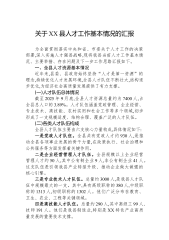 关于XX县人才工作基本情况的汇报为全面贯彻落实中央和省、市委关于人才工作的决策部署,深入实施人才强县战略,现将我县当前人才工作基本情况、主要举措、存在问题及下一步工作思路汇报如下。一、全县人才资源基本情况近年来,县委、县政府始终坚持“人才是第一资源”的理念,持续优化人才发展环境,全县人才队伍不断壮大,结构逐步优化,为经济社会高质量发展提供了有力支撑。(一)人才队伍总体情况截至2025年9月底,全县人才资源总量约为7400人,占全县总人口的3.89%。人才队伍涵盖党政管理、企业经营、专业技术、高技能、农村实用和社会工作等多个领域,初步形成了一支规模适度、结构合理、覆盖广泛的人才队伍。(二)各类人...