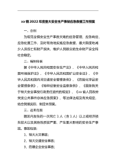 xx镇2022年度重大安全生产事故应急救援工作预案一、总则为规范全镇安全生产事故灾难的应急管理、应急响应、应急处置工作,及时有效地实施应急救援,最大限度地减少人员伤亡和财产损失,维护人民群众的生命财产安全和社会稳定。二、编制依据据《中华人民共和国安全生产法》、《中华人民共和国环境保护法》、《中华人民共和国矿山安全法》、《中华人民共和国内河交通安全管理条例》、《危险化学品安全管理条例》,《特种设备安全监察条例》、《国务院关于特大安全事故行政责任追究的规定》、《xx省人民政府突发公共事件总体应急预案》、等法律法规及有关规定,结合我镇实际,制定本预案。三、适用范围辖区内发生的一次死亡1人(含1人)以...