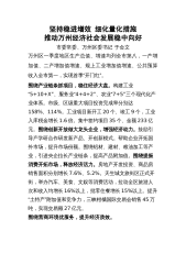 坚持稳进增效细化量化措施推动万州经济社会发展稳中向好市委常委、万州区委书记于会文万州区一季度地区生产总值、增速均列全市第八,一产增加值、二产增加值增速、规上工业增加值增速、公共预算收入全市第一,实现首季“开门红”。围绕产业链条抓项目,稳住经济大盘。构建工业“5+10+X”、服务业“4+4+2”、农业“7+5”三个现代化产业体系。市级、区级重大项目投资完成率分别达158%、114%。工业项目新开工20个、竣工9个,工业入库税金增长1.6倍。集中签约项目35个、金额233亿元。围绕创新开放做大龙头企业,增强经济动力。鼓励引导产学研合作研发新产品、开创新模式。帮助企业开拓国外市场,提升市场份额。围绕...