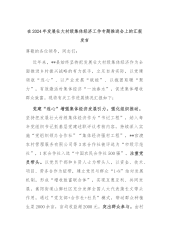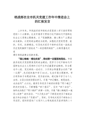 统战部在全市机关党建工作年中推进会上的汇报发言上半年来,市统战系统市级机关党委深入学习宣传贯彻党的二十大精神,扎实开展学习贯彻习近平新时代中国特色社会主义思想主题教育,以“党旗飘扬、凝心聚力”主题活动为载体,以党的政治建设为统领,加强机关党的思想、组织、作风、纪律建设,引导机关党员干部和动员统一战线成员在党的旗帜下团结成“一块坚硬的钢铁”,以高质量机关党建引领统战事业创新发展。“凝心铸魂·理论武装”,推动第一议题落地落实。市统战系统机关党委聚焦党的政治建设,把学习习近平新时代中国特色社会主义思想和习近平总书记重要讲话精神,作为理论中心组、党支部统一活动日、工作例会等重要会议的“第一议题”,先后...
