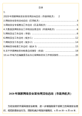 目录1.2020年国家网络安全宣传周活动总结(市级局机关)22.网络安全宣传活动总结(区局机关)...................................................33.网络安全专项整治工作总结(区县局机关).........................................54.大数据及网络安全工作情况自查总结(市级局机关).............................65.网络安全工作总结(市级)...............................................................86.网络...