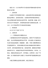 备战2022-2023秋冬季大气污染攻坚开展移动源污染专项整治行动方案一、总体目标以改善大气环境质量为目标,以柴油货车和非道路移动机械为监管重点,坚持源头防控、过程防控和协同防控相结合,充分运用移动源污染科技化监管手段,推进车辆(机械)排污清洁化水平持续提升,持续降低移动源污染物排放总量,为2022-2023年秋冬季大气污染攻坚夯实基础。二、时间安排2022年*月**日至**月**日三、主要任务(一)开展柴油车专项整治行动1.加快建设机动车尾气遥感监测点。按照大气污染防治法规定,充分利用遥感监测等技术手段,对在道路上行驶的机动车进行排放监督抽测,构建国家、省级、市级三级联网的机动车遥感监测平台...