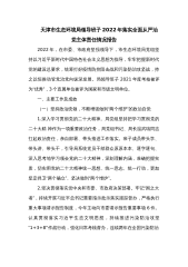 天津市生态环境局领导班子2022年落实全面从严治党主体责任情况报告2022年,在市委、市政府坚强领导下,市生态环境局党组坚持以习近平新时代中国特色社会主义思想为指导,牢牢把握新时代党的建设总要求,统筹打好疫情防控阻击战和污染防治攻坚战,持之以恒推动管党治党向纵深发展。局领导班子2021年度考核被评为“优秀”,3个直属单位被评为国家和市级文明单位。一、主要工作及成效(一)坚持政治统领,不断增强做到“两个维护”的政治自觉1.深入学习贯彻党的二十大精神。局党组坚持把学习贯彻党的二十大精神作为一项重要政治任务,局党组书记、局长温武瑞同志扛起政治责任,亲自部署、带头推进工作落实。班子成员带头学、带头讲、...