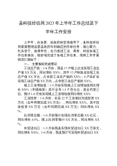 县科技经信局2023年上半年工作总结及下半年工作安排上半年,在县委、县政府的坚强领导下,县科技经信局紧紧围绕县委县政府年初确定的目标任务,凝心聚力、扎实苦干、奋勇争先,全力推进工业、商务、科技各项工作任务落实,较好地完成了各项工作任务。现将工作开展情况汇报如下:一、 主要指标完成情况工业总产值:1-6月份,我县17户规上企业实现工业总产值XX万元,同比增长XX%,其中13户制造业实现工业总产值XX万元,占全部工业总产值的XX%;4户采矿业实现工业总产值XX万元,占全部工业总产值的XX%。规上工业增加值:1-5月份实现规上工业增加值同比增长XX%(市级核算)高于全市1.3个百分点,居全市第三位。...