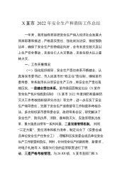 XX区应急管理局2022年工作总结及2023年工作思路2022年,区应急管理局紧紧围绕省、市应急管理工作部署和区委区政府的战略要求,突出抓好安全生产监管、自然灾害防控、应急能力提升、执法力度强化等中心工作,精准施策,把舵定向。X-X月,全区各类生产安全起数、亡人数同比前三年平均数分别下降X.X%和X.X%。汛期共启动防汛Ⅳ级应急响应X次,启动防汛Ⅲ级应急响应X次,顺利完成梅汛期X轮降雨防御工作。一、试点工作开展情况2022年,XX区应急管理局主动对接省、市应急管理部门,发扬“见红旗就扛、见第一就争”的冲锋精神,积极争取试点,承担省级试点任务X项,市级试点任务X项,某市级演练X场。一是破题应急资...