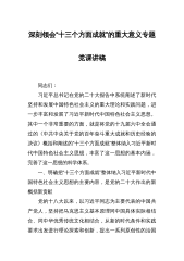党课讲稿:对“国之大者”做到心中有数,讲政治、顾大局、讲担当、为人民同志们:“国之大者”,简而言之就是国家的头等大事。2020年以来,习近平总书记在多个场合反复提及“国之大者”。党的十九届六中全会通过的《中共中央关于党的百年奋斗重大成就和历史经验的决议》强调:“党中央要求党的领导干部提高政治判断力、政治领悟力、政治执行力,胸怀‘国之大者’,对党忠诚、听党指挥、为党尽责。”广大党员干部要对“国之大者”做到心中有数,就是对大是大非、大事要务、大政方针要清醒把握,从而站位高、格局大、视野宽、做实事,用一句话来概括就是要“讲政治、讲大局、讲担当、为人民”。一、对“国之大者”做到心中有数,就是要旗帜鲜明...