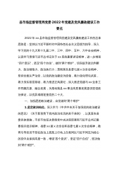 应急管理局委员会2022年党建和党风廉政建设工作要点 2022年是党的二十大召开之年,是贯彻党的十九届六中全会、省第十二次党代会、市第八次党代会精神的关键一年,加强党的建设意义重大。今年我局党建和党风廉政建设工作的总体要求是:以XJP新时代中国特色社会主义思想为指导,全面贯彻党的十九大和十九届历次全会精神深入贯彻落实XJP总书记考察调研山西重要指示精神,贯彻落实市委八届二次全会和市纪委八届二次全体会议精神按照市委、市政府决策部署和全市安全生产和应急管理工作重点工作,坚定不移加强党的全面领导,坚定不移全面从严治党,坚定不移正风肃纪,以党的政治建设为统领,全面推进党的各方面建设,不断提高党的建设质...