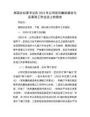 某国企纪委书记在2023年公司党风廉政建设与反腐败工作会议上的报告同志们:根据会议安排,下面,我代表公司纪委作工作报告。一、2022年主要工作回顾2022年,公司纪委在**股份公司纪委和公司党委的坚强领导下,坚持以习近平新时代中国特色社会主义思想为指导,全面贯彻落实党的十九届六中全会和二十大精神,围绕纪检监察年度重点工作安排,严格履行纪检监督职责,坚定不移推进全面从严治党,全面加强廉洁文化建设,深入推进党风廉政建设和反腐败工作,以过硬的纪律作风确保**纪委和公司党委的各项工作部署落实到位。(一)强化政治监督,压实“两个责任”公司纪委以加强政治监督为抓手,坚定捍卫“两个确立”坚决做到“两个维护”...