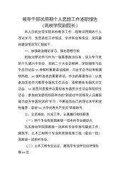领导干部试用期个人思想工作述职报告(高校学院副院长)本人目前分管学院本科教学工作,现将试用期内个人理论学习、负责承担工作情况、学术和业务情况、党风廉政建设情况等汇报如下。一、加强政治理论学习,强化思想引领把政治理论学习作为一项重要政治任务,深入学习党的十九届六中全会、党的二十大会议精神,深刻领悟习近平总书记在xx考察时重要讲话精神、习近平总书记考察调研高校、xx省时发表的重要讲话、作出的重要指示;认真参加党史学习教育专题民主生活会、巡察整改专题民主生活会、xx追责问责案件以案促改专题民主生活会和组织生活会;参加校党委组织部举办的“新提任中层领导人员履职能力提升专题培训班”学习,不断提高自己的理...