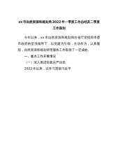 xx市自然资源和规划局2022年一季度工作总结及二季度工作谋划今年以来,xx市自然资源和规划局在省厅党组和市委市政府的坚强领导下,以党建为引领,主动作为,认真履职,自然资源和规划管理服务工作取得了一定成效。一、重点工作开展情况(一)深入推进全面从严治党2022年以来,以学习贯彻习近平新时代中国特色社会主义思想和党的十九届历次全会精神为主线,共召开党组理论中心组学习会议3次,举办党的十九届六中全会精神辅导报告3次,持续深化理论武装。印发《关于做好2022年元旦春节期间正风肃纪工作的通知》,压实“两个责任”,把中央八项规定精神落实落细。针对厅党组党内政治监督谈话反馈的3个方面13个问题,不折不扣抓...