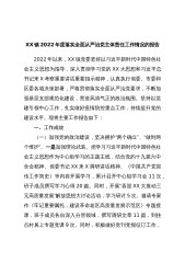 XX镇2022年度落实全面从严治党主体责任工作情况的报告2022年以来,XX镇党委坚持以习近平新时代中国特色社会主义思想为指导,深入贯彻学习党的XX大思想和习近平总书记来X考察重要讲话重要指示精神,认真执行省委、市委和区委各项决策部署,严格贯彻落实全面从严治党要求,不断加强基层支部规范化建设,营造风清气正的政治氛围。坚持以党建引领中心工作,扎实做好疫情防控重点工作,持续提升党的建设水平。现将主要工作报告如下:一、工作成效(一)加强党的政治建设,坚决拥护“两个确立”、“做到两个维护”。一是加强理论武装。把学习习近平新时代中国特色社会主义思想作为中心组学习的主题主线,结合党的十九届六中全会精神、省...