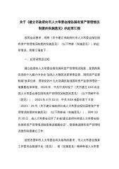 关于《建立市政府向市人大常委会报告国有资产管理情况制度的实施意见》的起草汇报按照会议要求,现将《关于建立市政府向市人大常委会报告国有资产管理情况制度的实施意见》(以下简称《实施意见》)的起草情况,简要汇报如下:一、起草背景及过程建立政府向人大常委会报告国有资产管理情况制度,是贯彻落实党的十九届六中全会“加强人大预算决算审查监督、国有资产监督职能”改革任务,贯彻党的十九大强调的加强国有资产监督管理的一项重要改革举措。2020年,中共中央印发了《关于建立XXX向全国人大常委会报告国有资产管理情况制度的意见》(以下简称中央《意见》)。2021年3月31日,中共XXX省委印发了X发〔2021〕25号《...