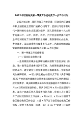 2022年区民政局第一季度工作总结及下一步工作计划2022年以来,我区民政工作在区委、区政府的正确领导和上级民政主管部门的精心指导下,坚持以习近平新时代中国特色社会主义思想为指导,深入贯彻党的十九大和十九届二中、三中、四中、五中、六中全会精神及习近平总书记对民政工作的重要指示精神,落实落细社会救助、养老服务、基层治理和社会事务等工作,为加快全面建设富裕协调美丽和谐幸福的现代化新xx作出贡献。一、第一季度工作完成情况(一)强化社会救助力量一是持续抓好城乡低保审核确认权限下放至乡镇(街道、场)指导监管业务培训等工作。为统筹推进城乡社会救助工作,建立健全分层分类的社会救助体系,兜牢基本民生保障底线。...