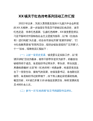 XX镇关于红色传奇系列活动工作汇报2022年以来,为深入贯彻落实党的十九届六中全会和党的XX大精神,进一步加强引导党员干部铭记红色历史、追寻红色足迹、传承红色基因、弘扬红色精神,XX镇党委坚持以习近平新时代中国特色社会主义思想为指导,以“将《红色传奇》进行到底”为主题,结合全市深化开展“党课开讲啦”、“打卡红色教育基地”等系列活动,组织全镇各党组织广泛开展“八个一”活动,现将情况汇报如下:(一)上好一堂党史党课。镇党委立足实际工作,以“党课开讲啦”活动为载体,领导干部带学促学为抓手,积极发动镇领导班子成员、各党组织书记带头学、带头讲、带头实践,用通俗易懂的“土话”和《红色传奇》经典故事,给基层...