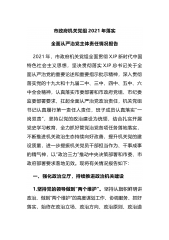 市政府机关党组2021年落实全面从严治党主体责任情况报告2021年,市政府机关党组全面贯彻XJP新时代中国特色社会主义思想,坚决贯彻落实XJP总书记关于全面从严治党的重要论述和重要指示批示精神,深入贯彻落实党的十九大和十九届二中、三中、四中、五中、六中全会精神,认真落实市委部署和市政府党组、市纪委监委部署要求,扛起全面从严治党政治责任,机关党组书记认真履行第一责任人责任,班子成员认真落实“一岗双责”,坚持以党的政治建设为统领,结合扎实开展党史学习教育,全力抓好管党治党各项任务落地落实,不断推进机关政治生态持续向好改善,提升机关党的建设质量,进一步提振机关党员干部担当作为、干事成事的精气神,以“...