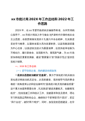 xx市统计局202X年工作总结和2022年工作思路202X年,在xx市委市政府的正确领导和省、台州市局精心指导下,xx市统计局深入学习领会XJP新时代中国特色社会主义思想,全面贯彻落实党的十九届六中全会精神,扎实推进党史学习教育,以服务发展大局为首要职责,以提高数据质量为中心任务,以推进依法统计为重要保障,以坚持改革创新为不竭动力,履行新使命、实现新作为、展现新气象,为xx打造浙东南地区重要发展极、建设“重要窗口”的“美丽示范点”提供坚实统计保障。一、202X年工作总结(一)坚守信仰之魂,党的建设全面加强一是抓住思想政治建设“定盘星”。聚力于强化统计机关政治首位意识和政治机关定位,从党的建设、...