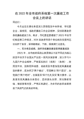 在2022年全市政府系统第一次廉政工作会议上的讲话同志们:今天会议主要任务是深入贯彻落实中央和省、市纪委全会,国务院、省政府廉政工作会议精神,安排部署政府系统廉政建设工作。刚才,市纪委监委通报了2021年全市纪检监察工作情况,XXX县政府等四个单位相关负责同志分别作了发言,讲得都很好。下面,我强调三点意见。一、充分肯定成绩,政府系统廉政建设取得显著成效2021年,全市政府系统认真贯彻以习近平同志为核心的党中央关于全面从严治党一系列决策部署,深入学习十九届六中全会精神,严格落实执行《准则》《条例》,按照党中央、国务院和省委、省政府及市委加强党风廉政建设的要求,坚决捍卫“两个确立”,牢固树立“四个...