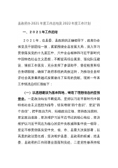 县政府办2021年度工作总结及2022年度工作计划一、2021年工作总结2021年,在县委、县政府的正确领导下,政府办全体党员干部团结一致,紧紧围绕全县发展大局,深入学习贯彻落实党的十九届五中、六中全会精神和习近平新时代中国特色社会主义思想,不断提高综合素质、强化队伍建设、狠抓工作落实,充分发挥了参谋助手、督促检查和综合协调职能,确保了政府系统的高效运转,为推动全县经济社会高质量跨越式发展做出了应有的贡献。现将一年来工作情况总结汇报如下:(一)以思想建设为基本阵地,铸造了理想信念的坚强堡垒。一是政治站位不断提高。坚持以习近平新时代中国特色社会主义思想为指导,切实增强“四个意识”、坚定“四个自信...