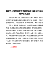 县委办公室学习宣传贯彻党的十九届X中X会精神工作方案在建党xx周年之际,党中央召开十九届X中X会,全面总结党百年奋斗的重大成就和历史经验并作出《决议》,为我们赓续精神血脉,弘扬党的精神,传承党的传统,更加主动扛起“‘先发力、带好头’的政治责任,不断汇聚××振兴发展精神力量,系统推进各项工作实现高质量发展”指明了前进方向、提供了根本遵循。为深入学习宣传贯彻党的十九届六中精神,切实将全办党员干部的思想统一到党的十九届X中X会精神上来,严格按照中央和省州县委关于学习宣传贯彻十九届X中X会精神的部署安排,根据《关于印发《某县学习宣传贯彻党的十九届X中X会精神工作方案》的通知》精神相关要求,结合我办实际...