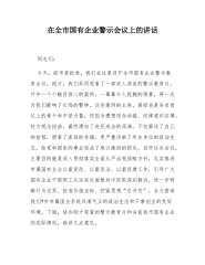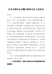 在全市国有企业警示会议上的讲话同志们:今天,经市委批准,我们在这里召开全市国有企业警示教育会议。刚才,我们共同观看了一部发人深省的警示教育片,片中一个个触目惊心的案例,一幕幕令人扼腕的场景再一次为我们敲响了长鸣的警钟。这些案例的主角,曾经也是各自岗位上的骨干和中坚力量,但因为理想信念动摇纪律意识淡薄、权力观念扭曲,最终滑向了违纪违法的深渊,不仅葬送了自己的前程,损害了家庭的幸福,更严重污染了所在单位的政治生态,给党和国家的事业造成了难以挽回的损失。召开这次会议,主要目的就是深入贯彻落实全面从严治党战略方针,扎实推进市属国有企业以案促改、以案促治、以案促建工作,引导广大国有企业干部职工从这些反面...