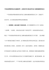市发改委模范机关创建材料:多措并举推动省市县三级联建模范机关 **市发展改革委创新落实省市县三级联动建设模范机关工作,实践实干、担当作为,全力推动发展改革事业高质量发展。一、高度重视,健全创建工作组织体系。把三级联建和中心工作一起谋划、一起部署、一起落实,省动员会议后第一时间召开市、县发改系统动员会议,制定《**市发展改革系统省市县三级联动建设模范机关工作方案》,提出构建“1+6”模范机关建设工作格局,全力朝着全国文明单位目标迈进。委内成立由委主要负责人为组长,其他党组(班子)成员为副组长,各科室、委属单位及区市发改部门主要负责人参与的工作领导小组,统筹推进三级联动建设模范机关工作,今年以来委...